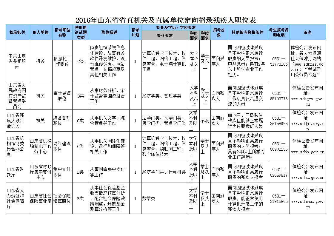 2016年山东省省直单位定向招录残疾人公务员公告